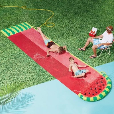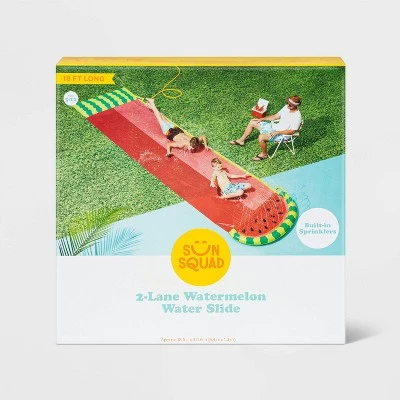 Ready, set, go for an exhilarating ride on the Sun Squad™ Watermelon Water Slide. With a fun and fruity watermelon design, this 18 ft 2-lane water slide features a water-filled launch ramp and a splash pool at the end waiting to soak riders. Just connect it to any standard garden hose and race your friend as built-in sprinklers provide a refreshing spray. Everyone will win with this Double Water Slide all season.